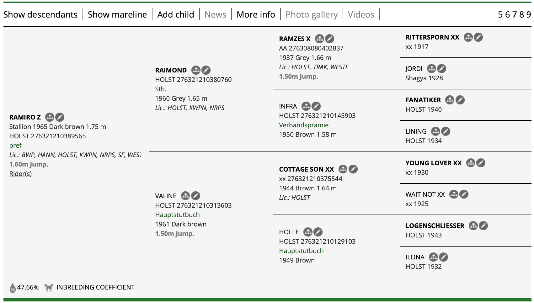 Ramiro’s sire, Raimond, was born in 1960 out of Infra, a mare by Fanaticker. According to The Holsteiner Horse, his offspring were known for their uniformity, strong character, reliability, and rideability, particularly when crossed with Thoroughbred mares. While Raimond produced several approved stallions, Ramiro, born in 1965 out of Valine (by Cottage Son xx), was the only one to achieve widespread success. Interestingly, Valine, his dam, had only one foal before moving to Italy, where she proved herself as a talented showjumper.